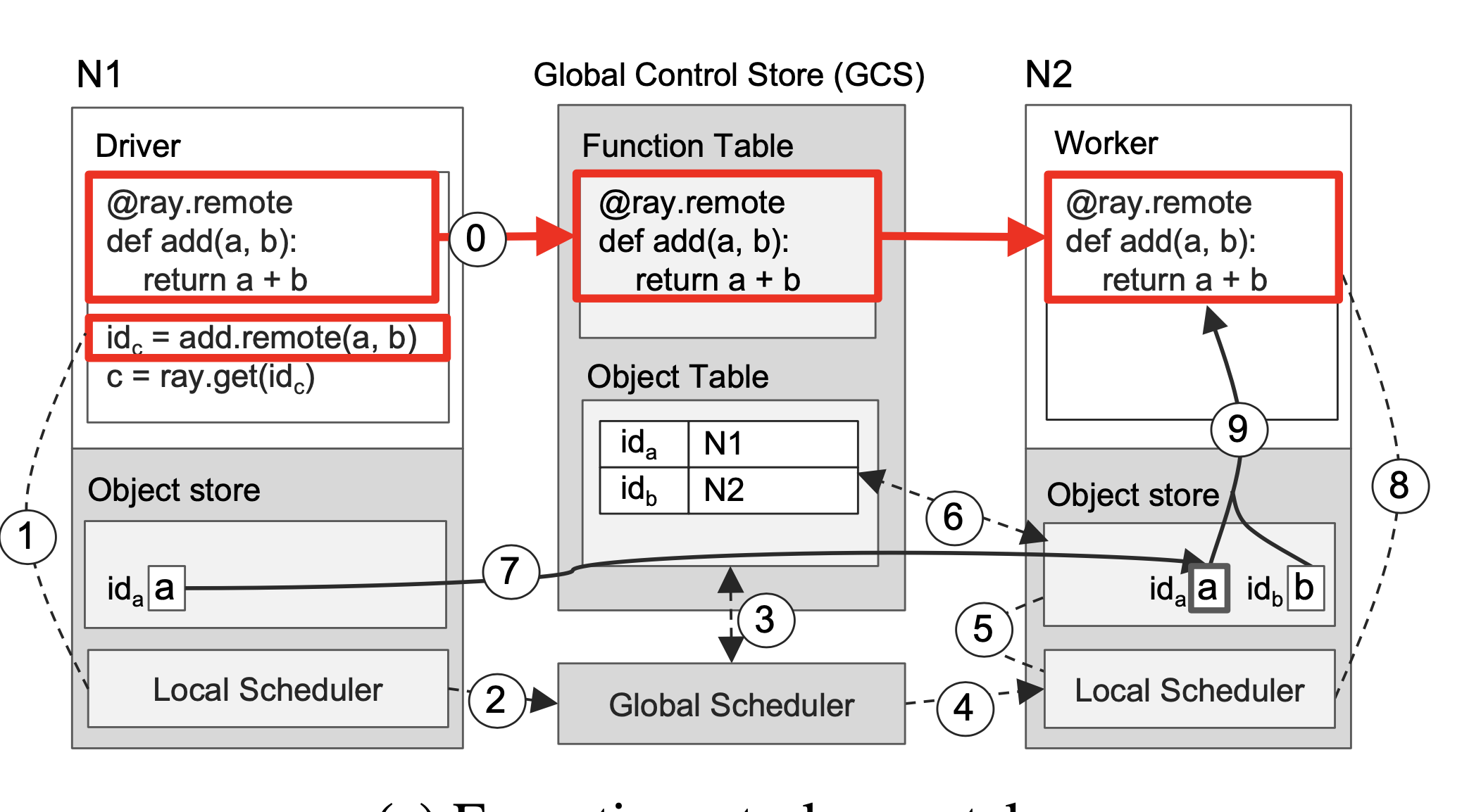 解析运行流程,我们可以发现,ray在运行时,总是先尝试在本地寻找对应的资源,并且在将资源复制到本地之前,都不会立刻执行对应的任务。整个流程就是本地-全局-本地的一个流程。由于论文中的一些例子都比较就,下一篇架构解析,我们会从最新版本的文档和白皮书入手。