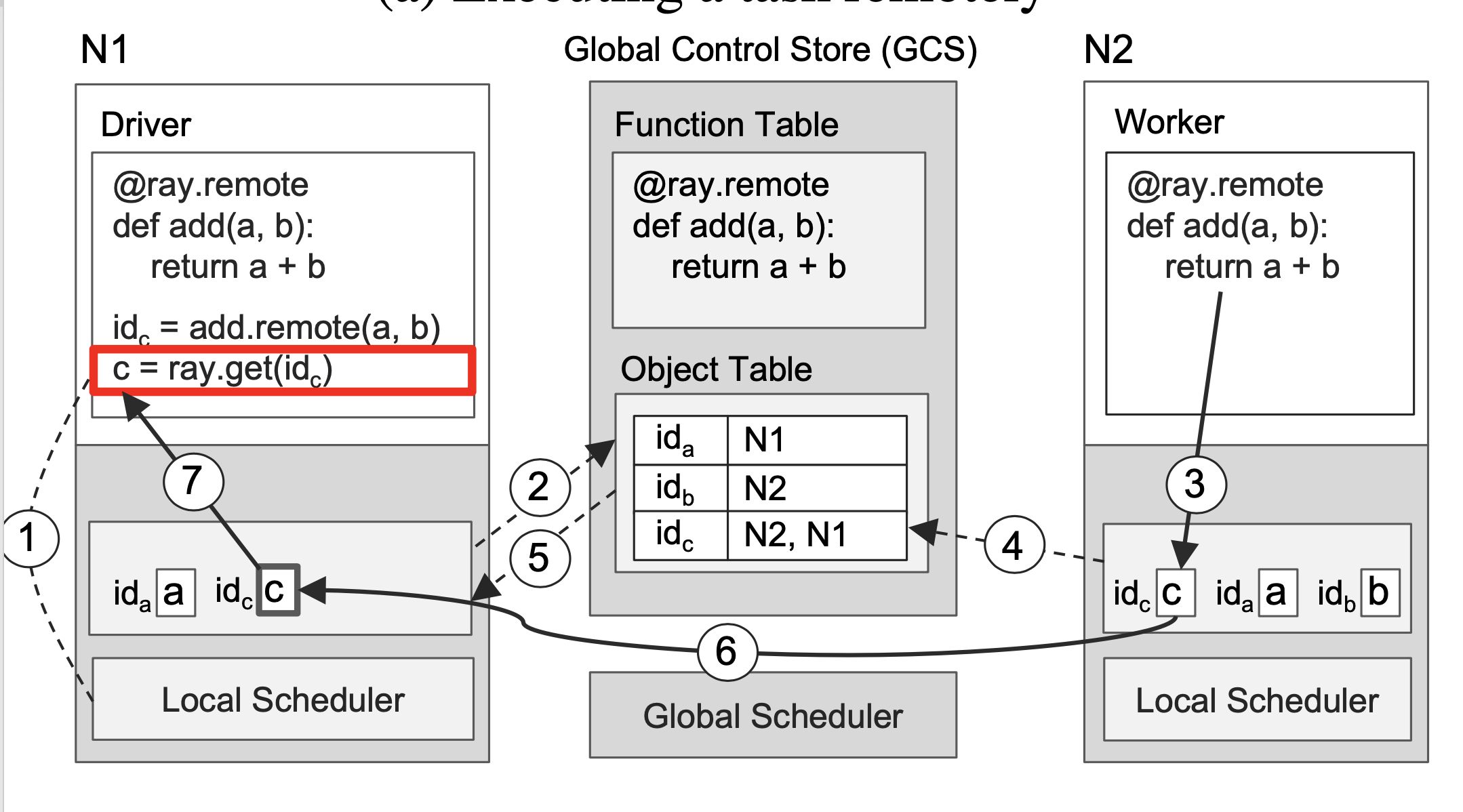 如果在全局调度器进行调度,它选择在N2节点上执行这个task,N2节点上的本地调度收到调度信息后,会查看本地的对象存储中是不是存在task的两个输入对象,此时objA并不在N2节点上,他需要从GCS中的object table(对象-存储位置表)拿到objA的地址,并且复制到N2上,这个时候两个输入参数都全了,本地调度器可以在N2的worker上执行这个函数。
